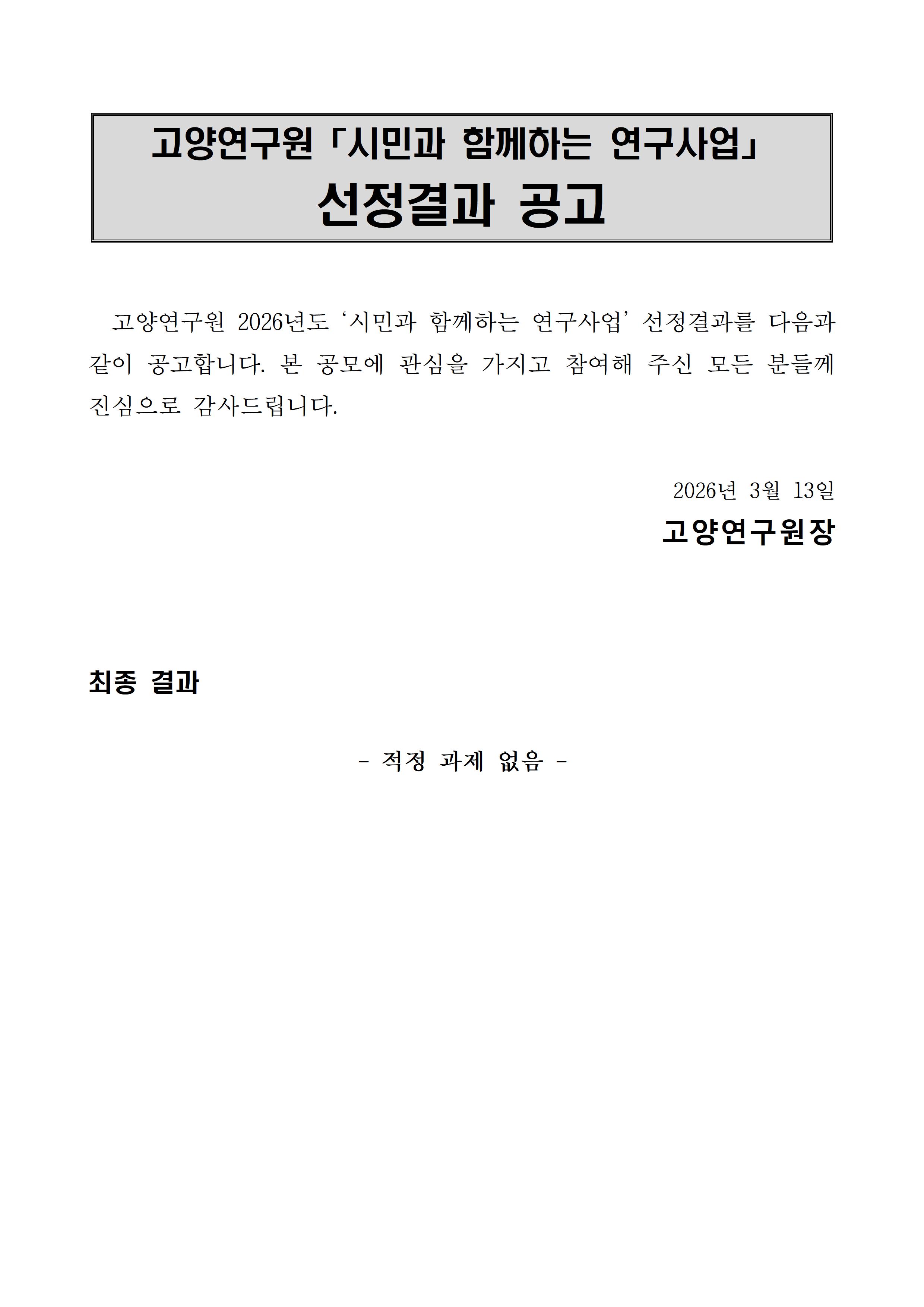 2026년 고양연구원 「시민과 함께하는 연구사업」 선정결과 공고
