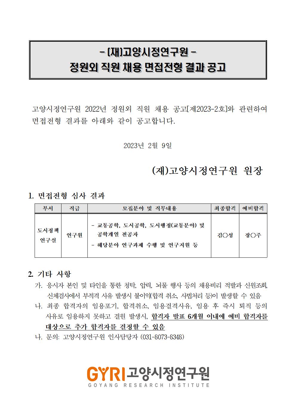 고양시정연구원 정원외 직원 채용 면접 전형 결과 공고
