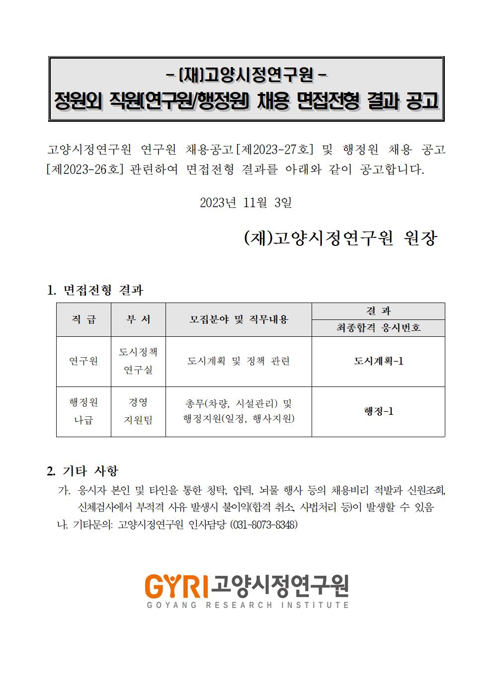 고양시정연구원 정원외 직원 채용 면접심사 합격자 공고