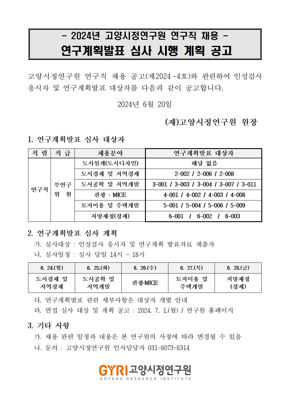 [제2024-4호] 2024년 고양시정연구원 연구직 채용 연구계획발표 심사 시행 계획 공고