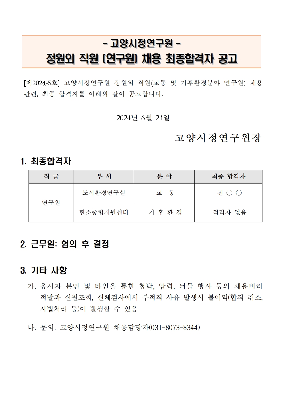 고양시정연구원 정원외 직원(교통 및 기후환경분야 연구원) 채용 최종합격자 공고