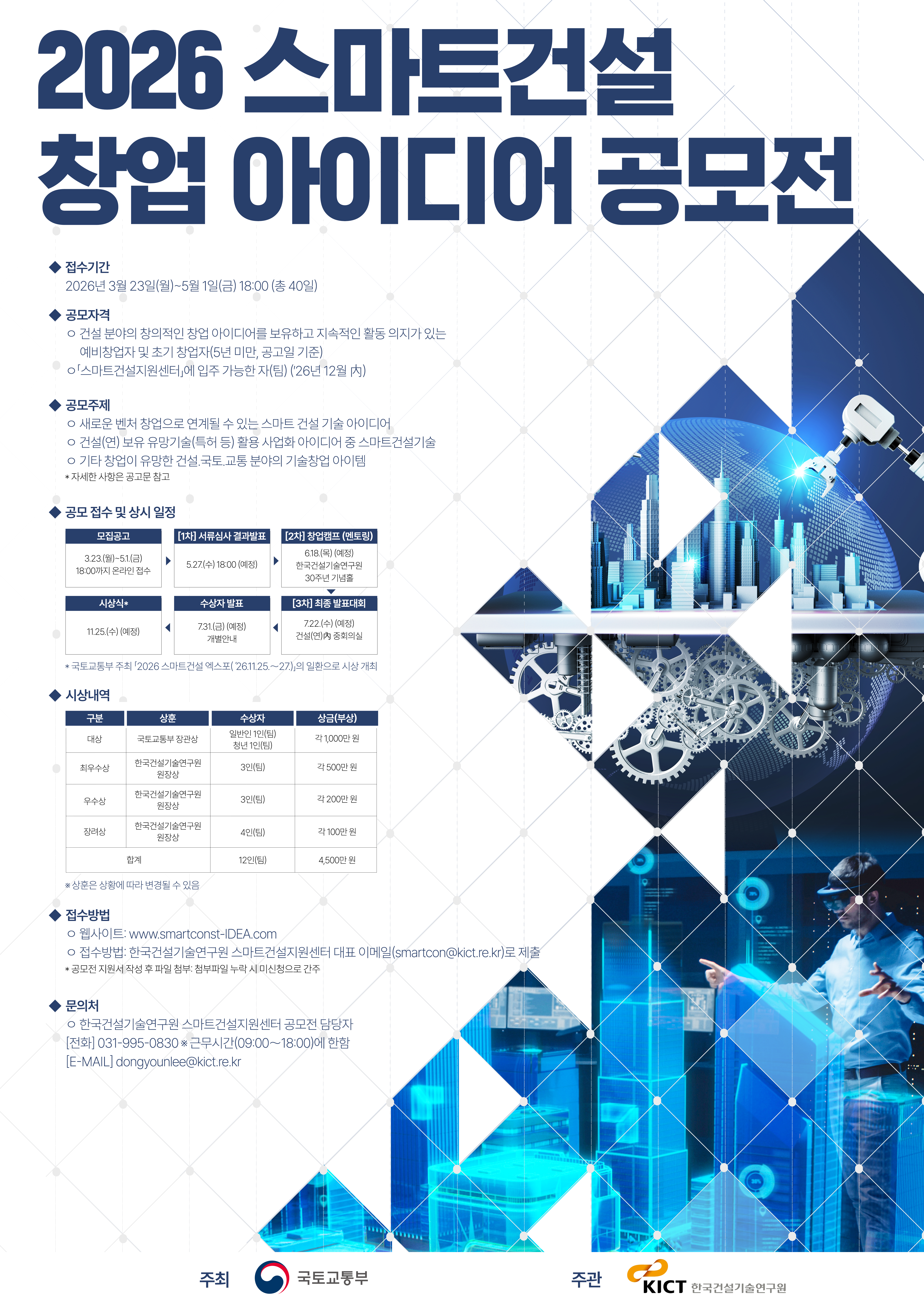 한국건설기술연구원 스마트건설지원센터 『2026 스마트건설 창업 아이디어 공모전』 개최