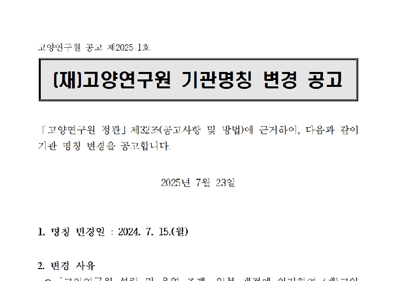 고양연구원 기관명칭 변경 공고