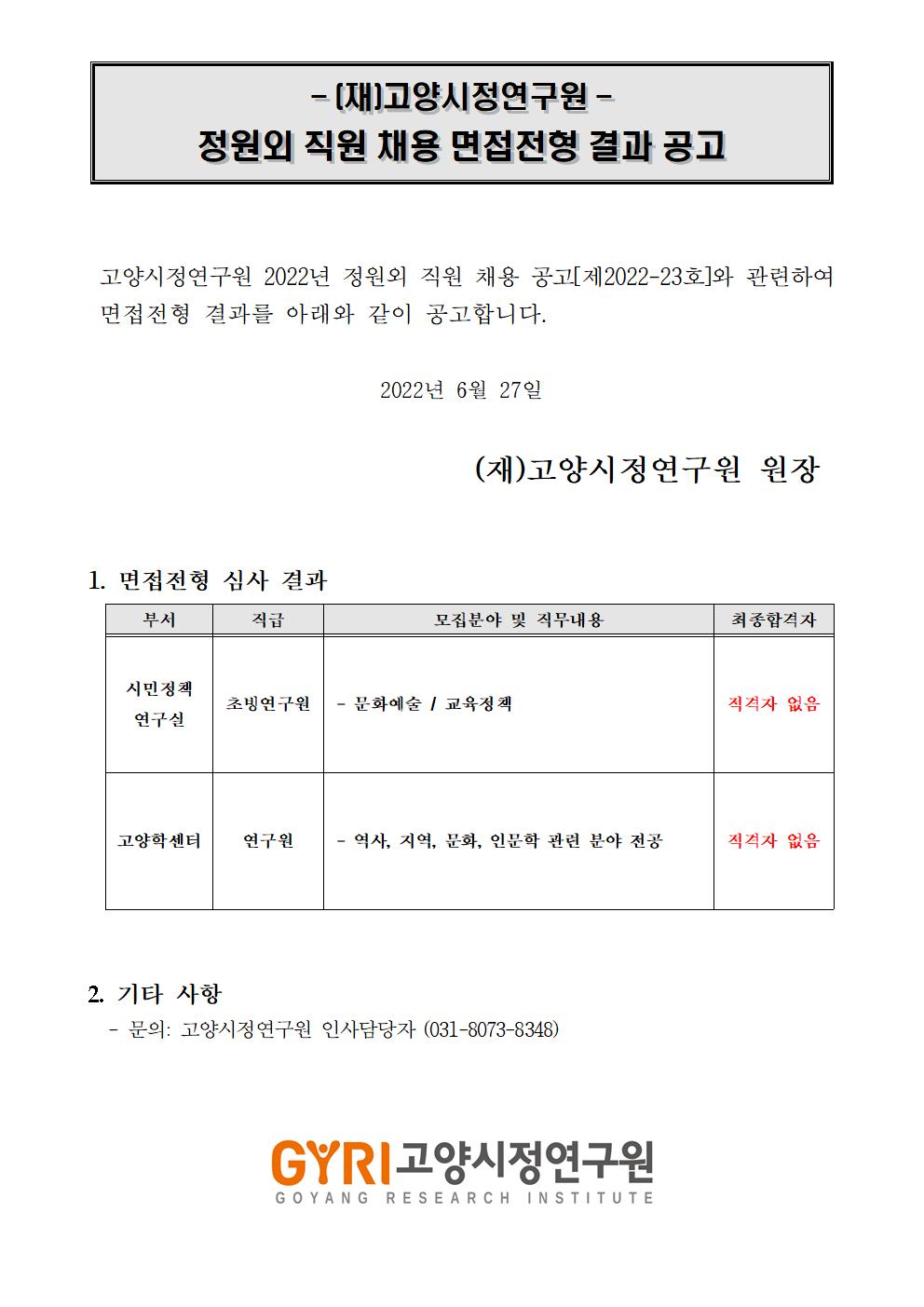 [제2022-26호] 고양시정연구원 정원외 직원 채용 면접 전형 결과 공고