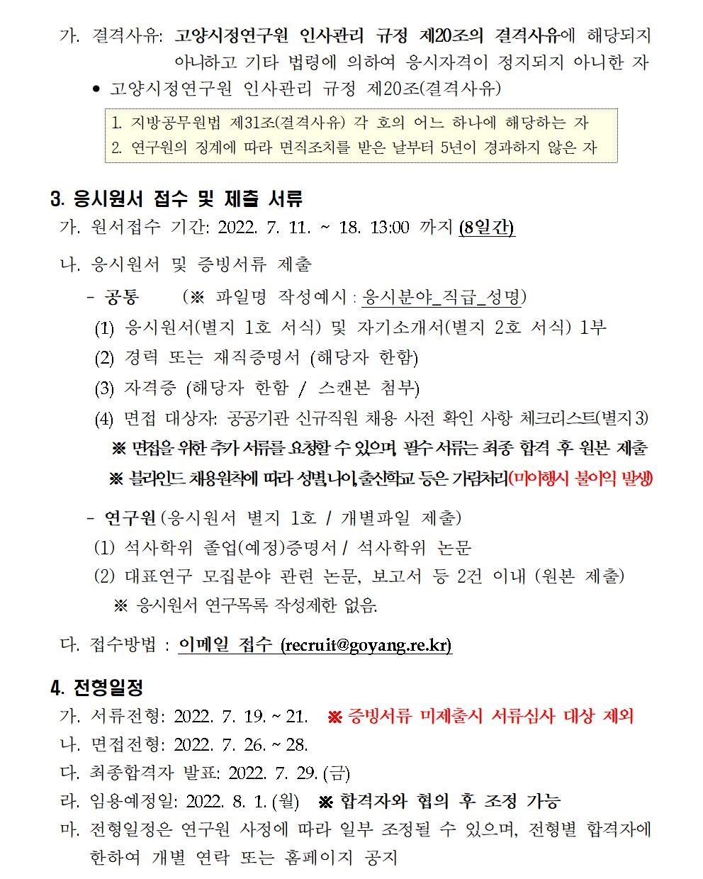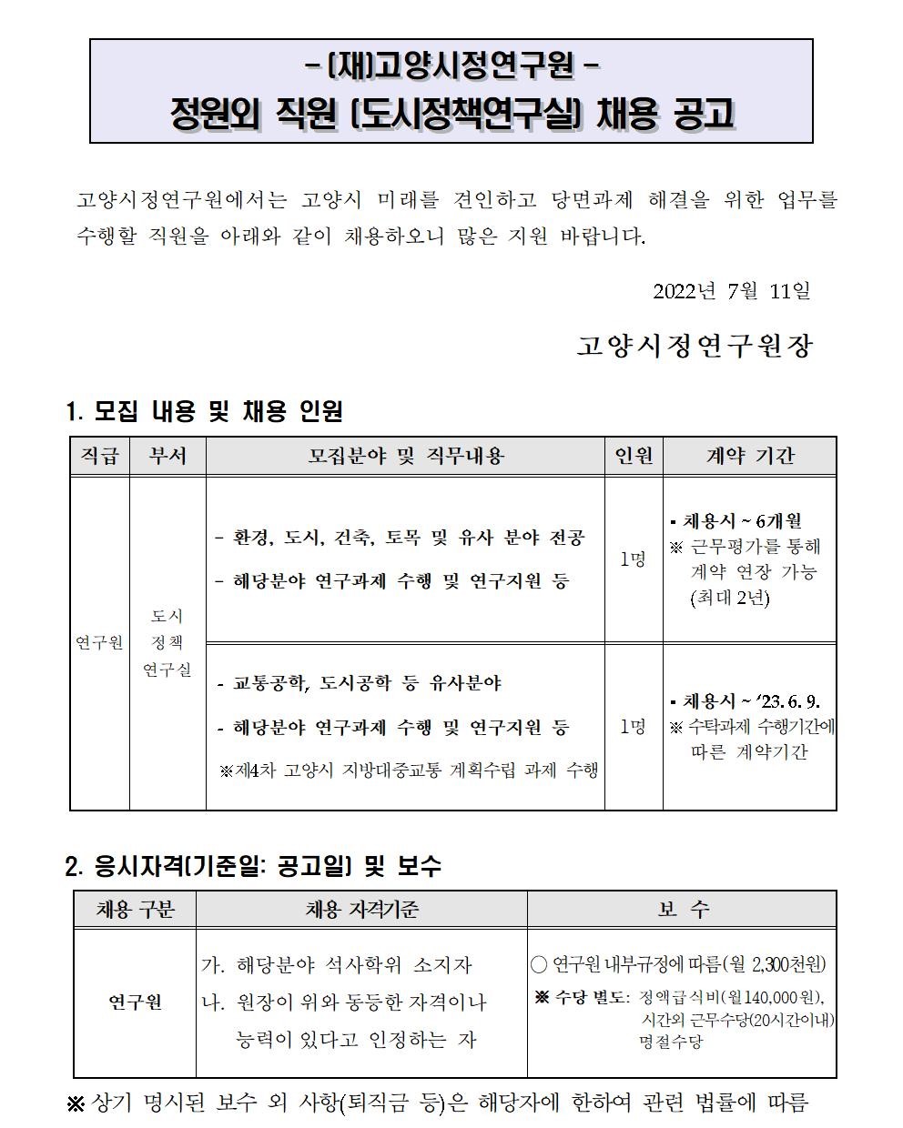 [제2022-29호] 고양시정연구원 정원외 직원(도시정책연구실) 채용 공고