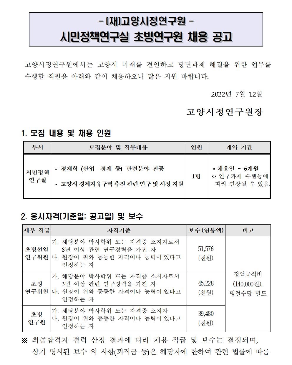 [제2022-30호] 고양시정연구원 시민정책연구실 초빙연구원 채용 공고