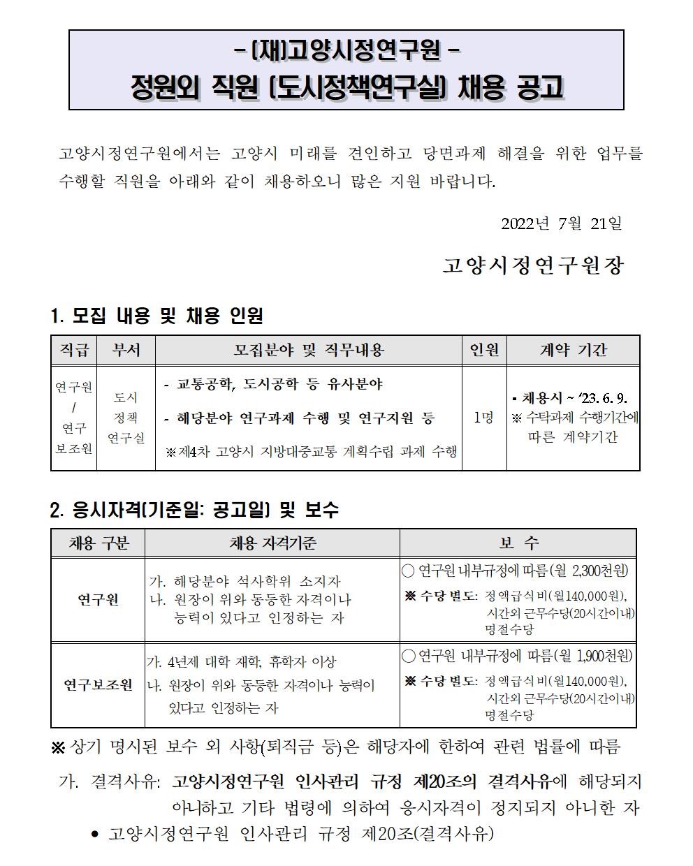 [제2022-32호] 고양시정연구원 정원외 직원(도시정책연구실) 채용 공고