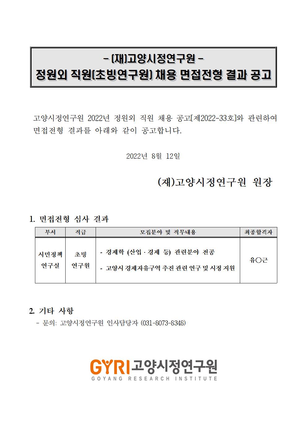 [제2022-39호] 고양시정연구원 시민정책연구실 초빙연구원 채용 면접 전형 결과 공고