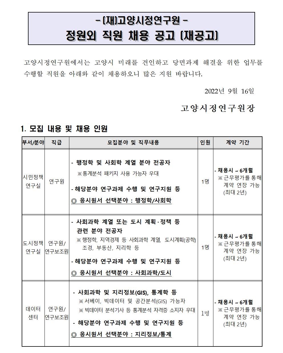 [제2022-44호] 고양시정연구원 정원외 직원 채용 공고 (재공고)