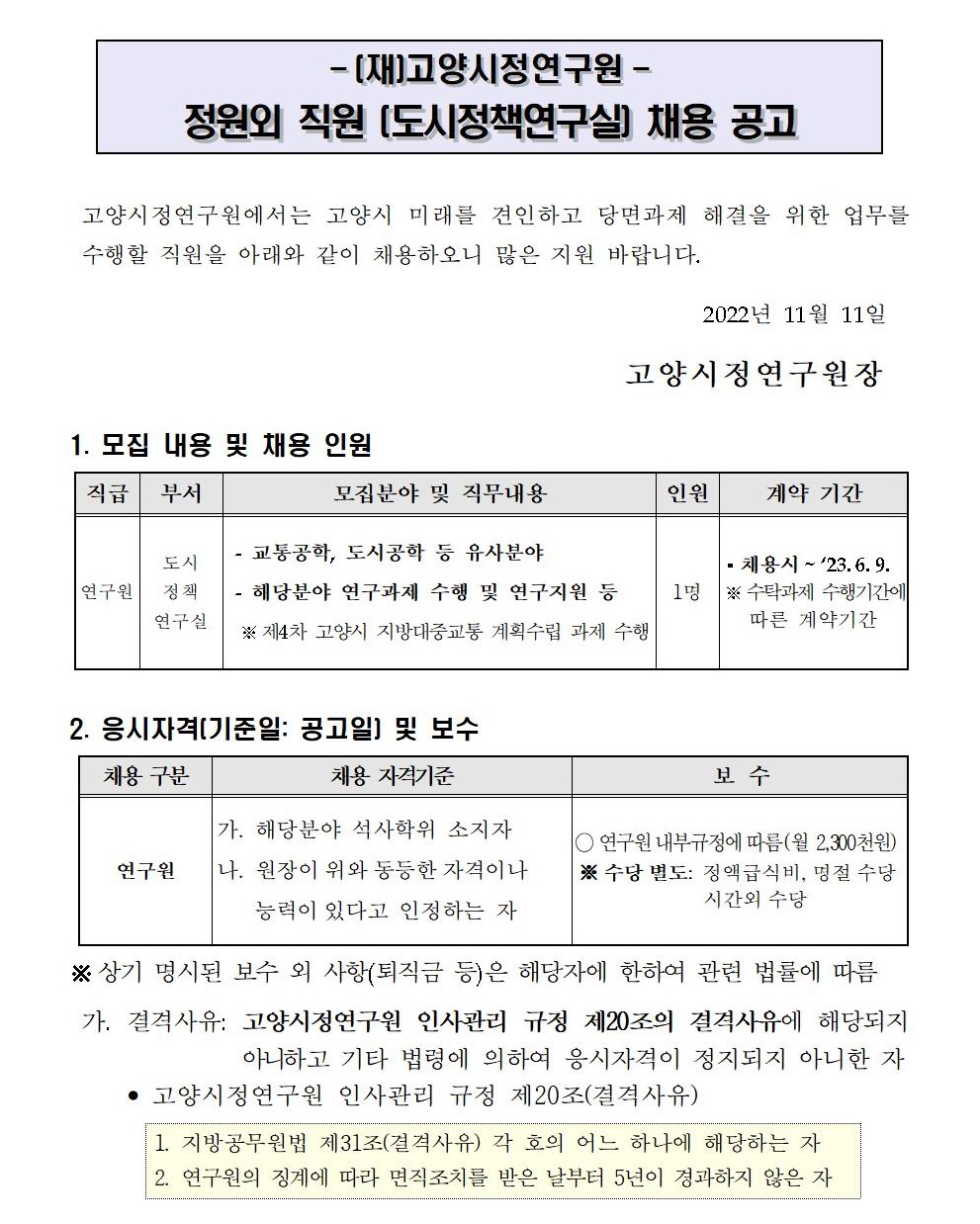 [제2022-49호] 고양시정연구원 정원외 직원(도시정책연구실) 채용 공고