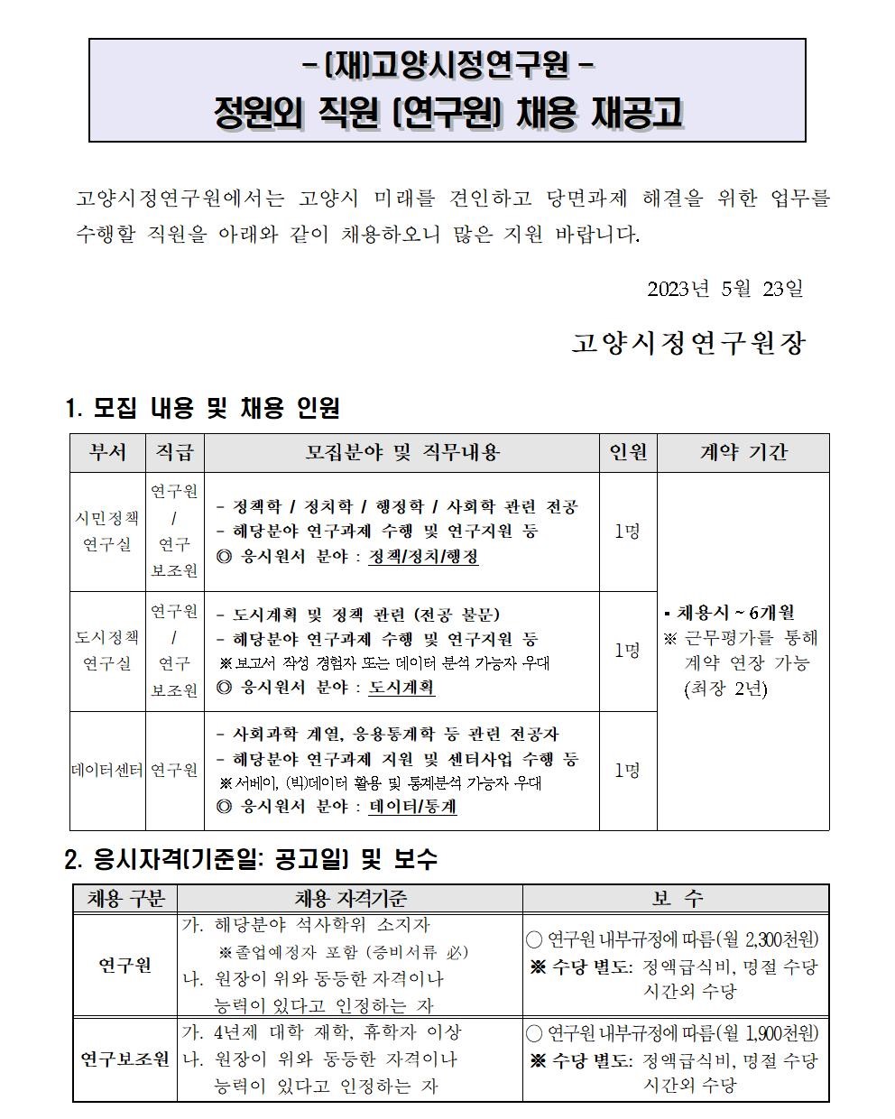 [제2023-13호] 고양시정연구원 정원외 직원(연구원) 채용 공고 (재공고)