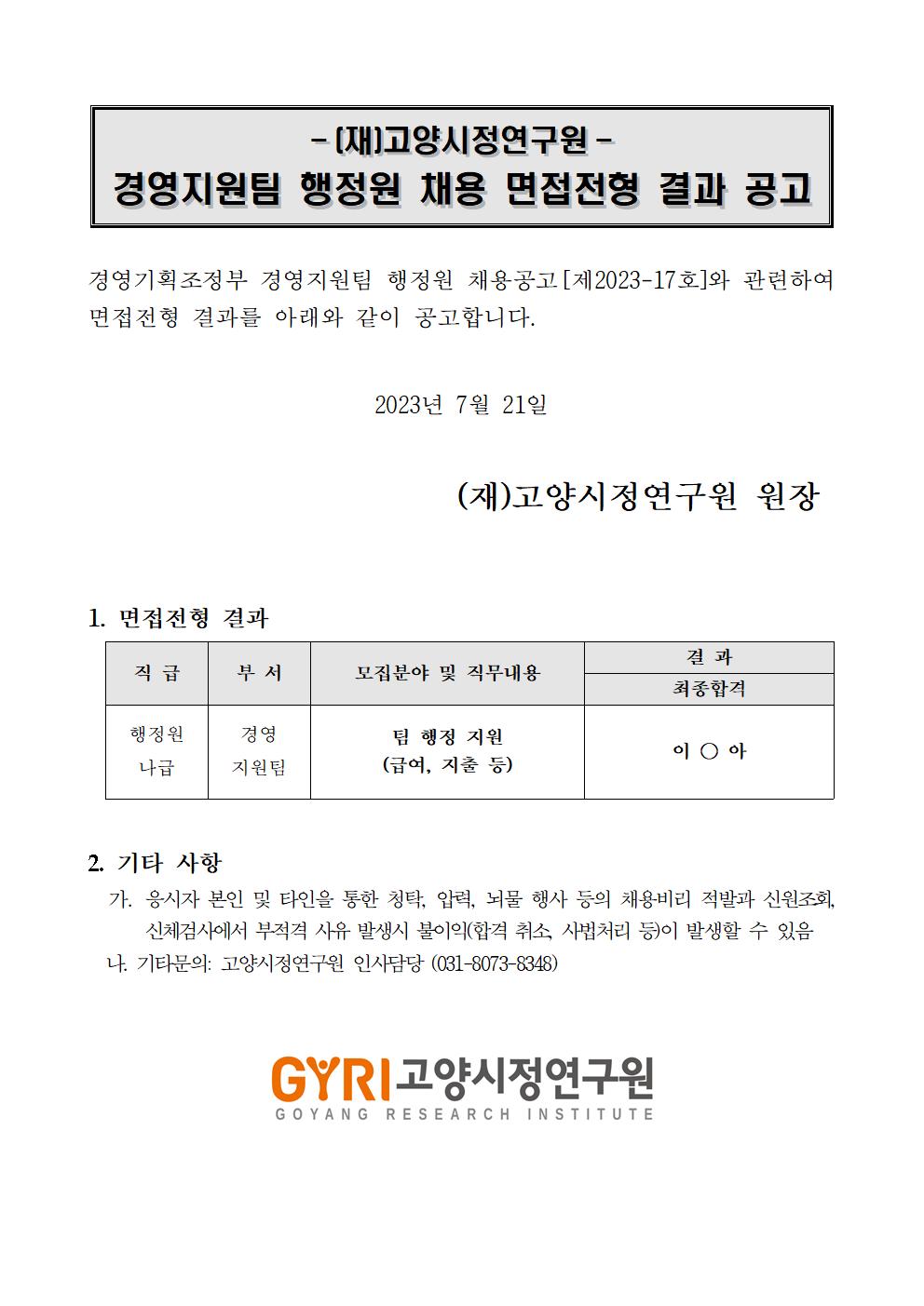[제2023-20호] 경영지원팀 행정원 채용 면접전형 결과 공고