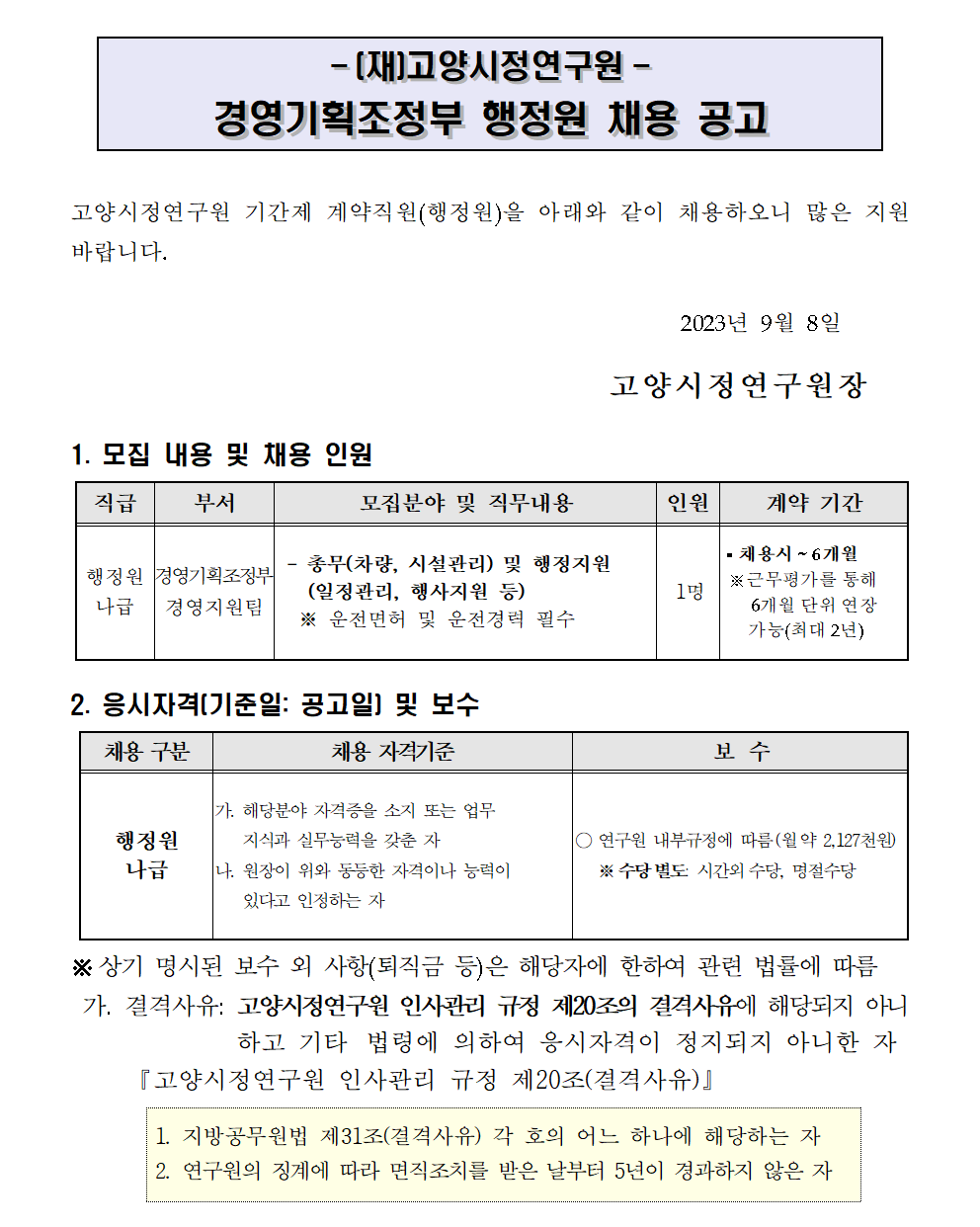 [제2023-26호] 고양시정연구원 행정원 채용 공고 (재공고)