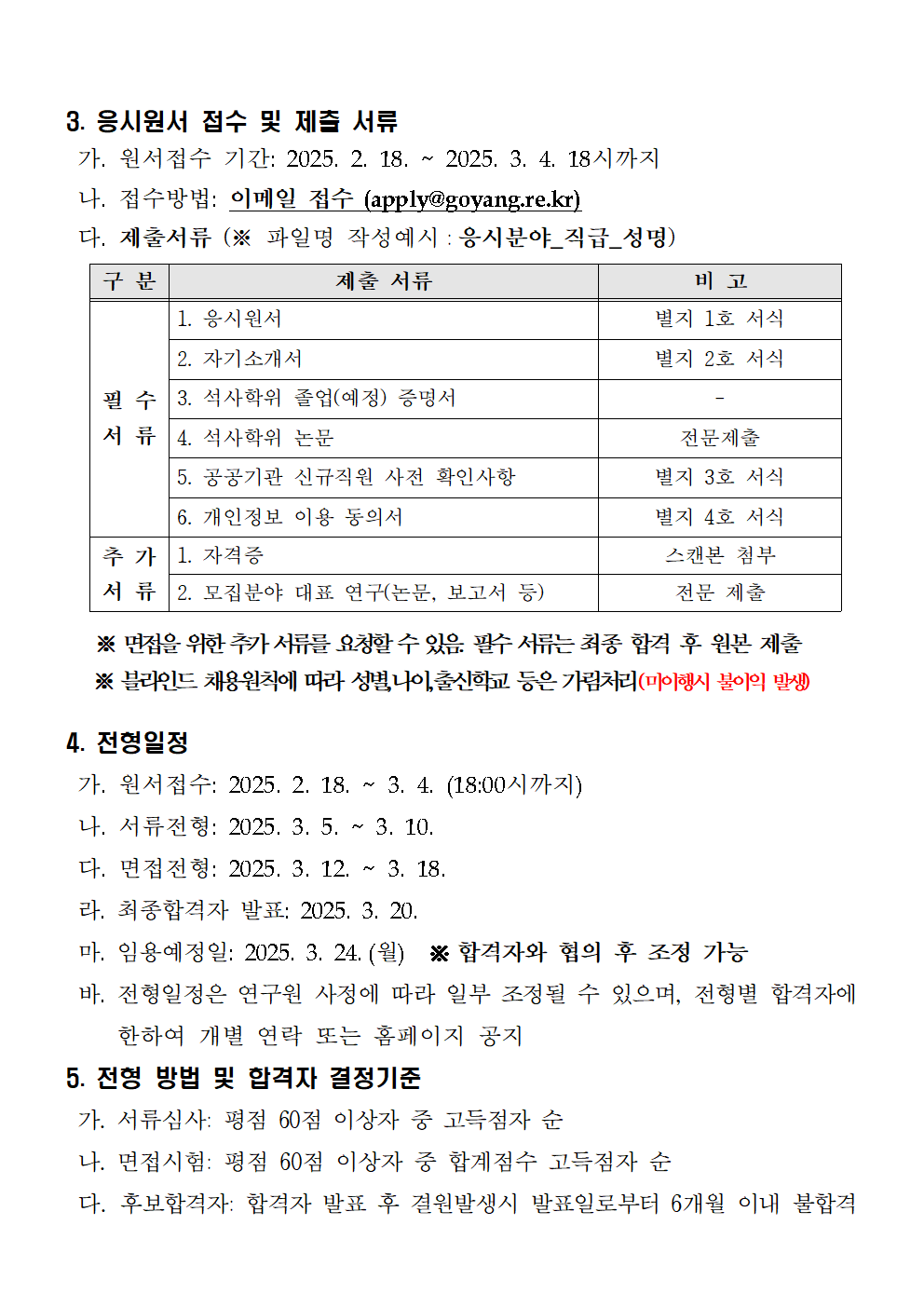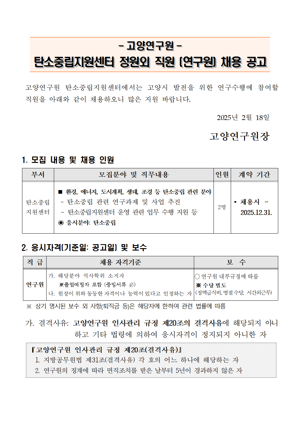 [제2025-01호] 고양연구원 탄소중립지원센터 정원외 직원(연구원) 채용 공고