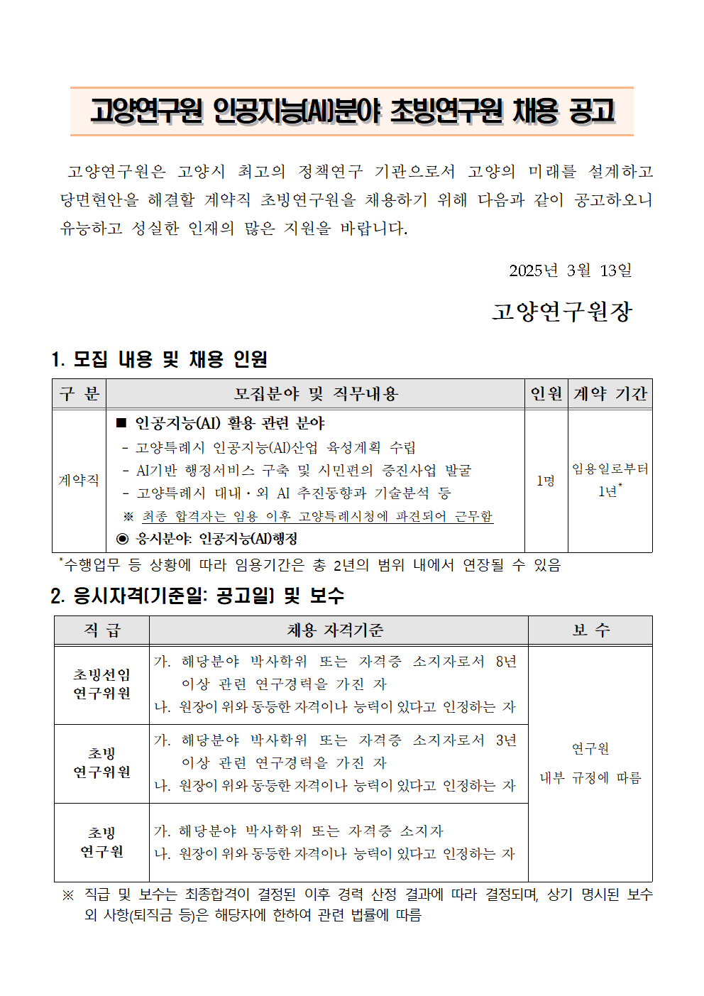 [제2025-02호] 고양연구원 인공지능(AI)분야 초빙연구원 채용 공고
