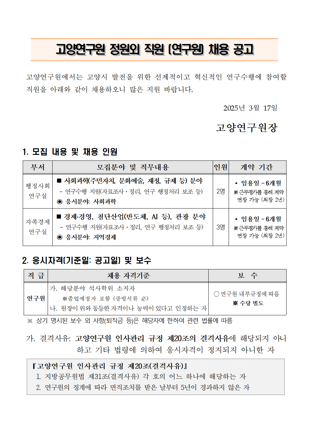 [제2025-03호] 고양연구원 정원외 직원(연구원) 채용 공고