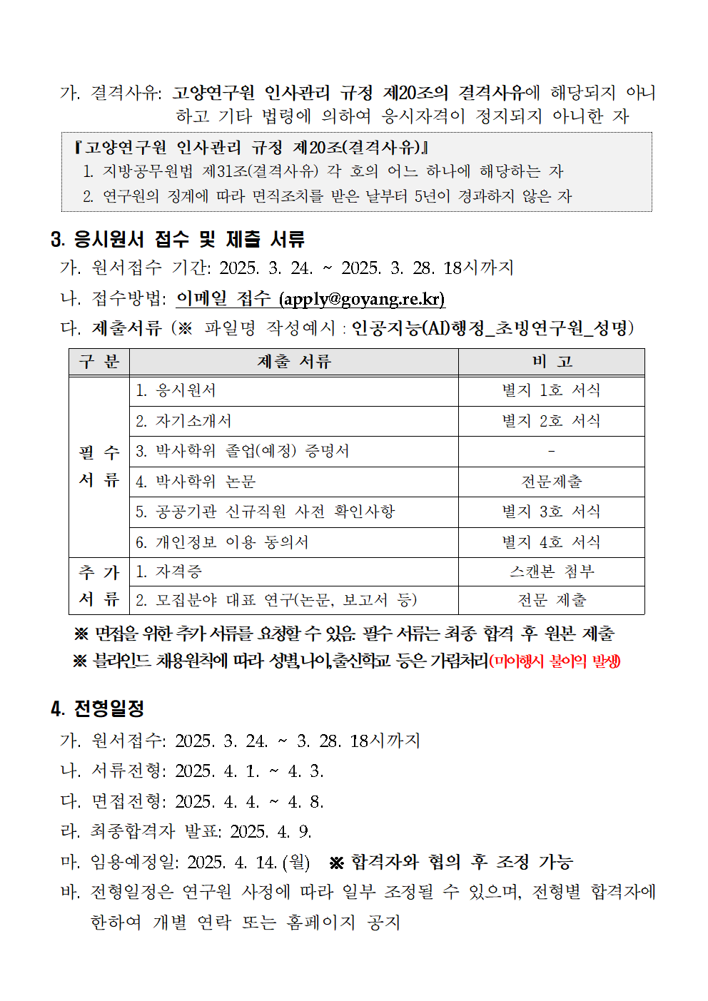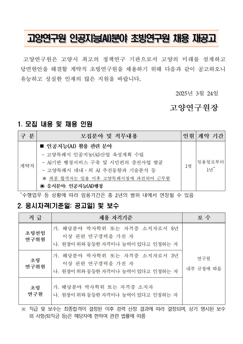 [제2025-02호] 고양연구원 인공지능(AI)분야 초빙연구원 채용 재공고