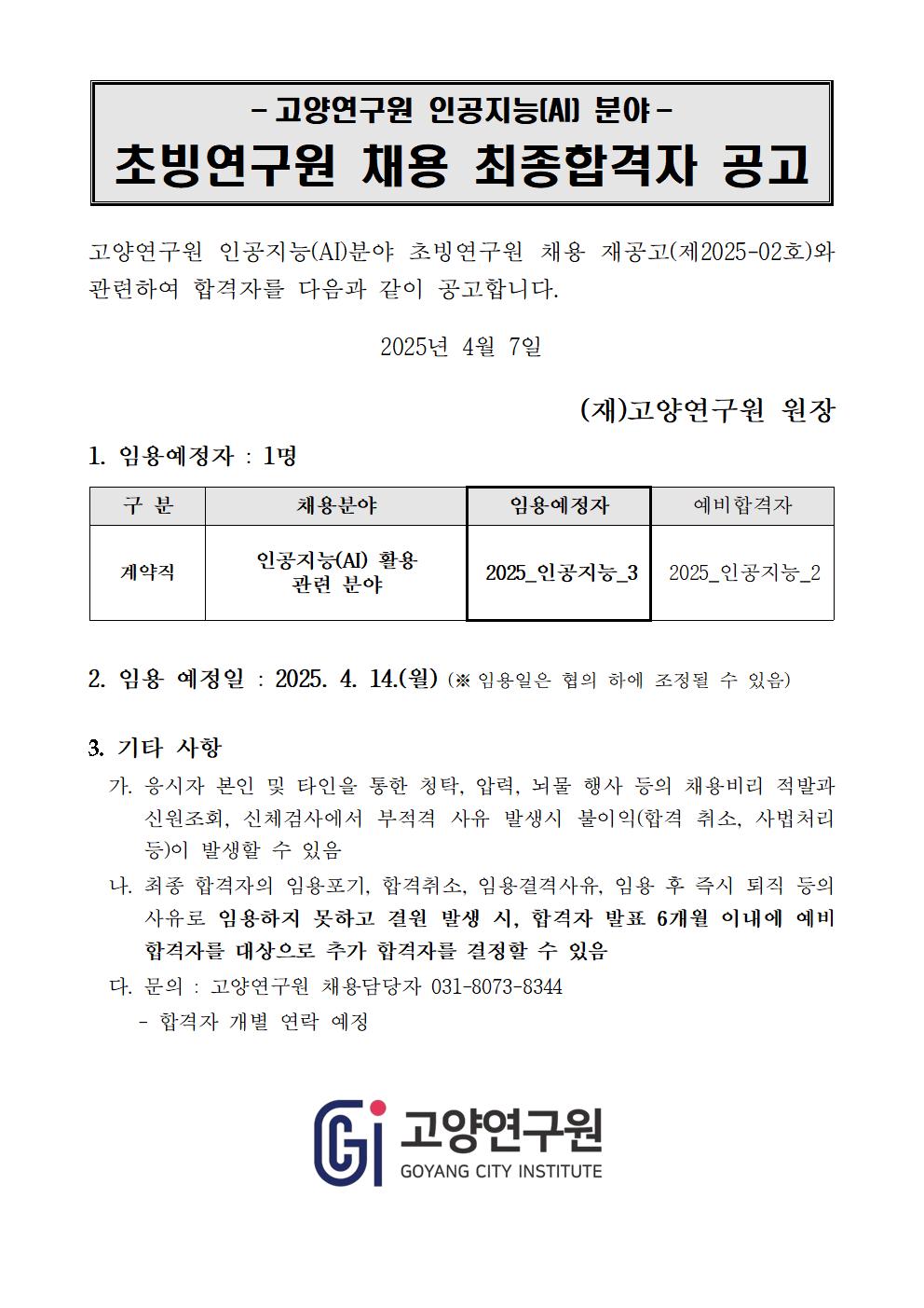 [제2025-02호] 고양연구원 인공지능(AI)분야 초빙연구원 채용 최종 합격자 공고