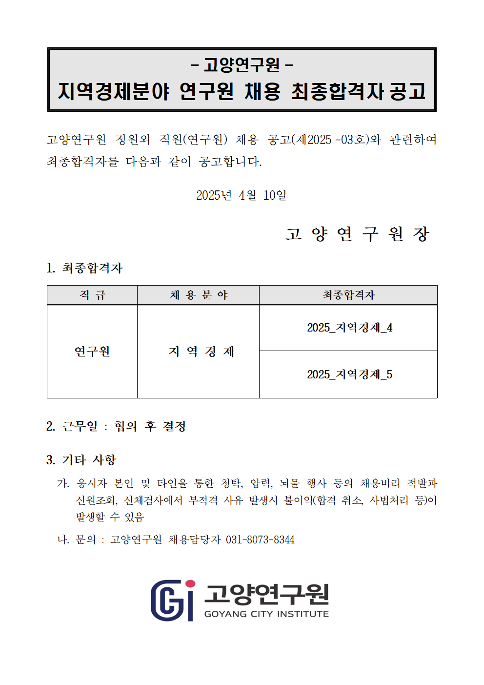 [제2025-03호] 고양연구원 지역경제분야 연구원 채용 최종 합격자 공고