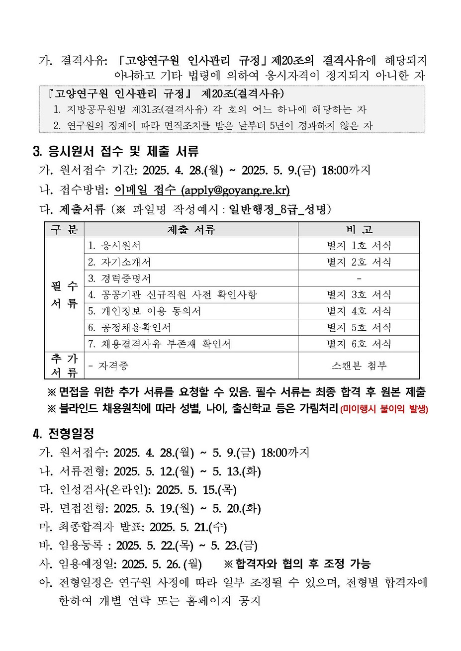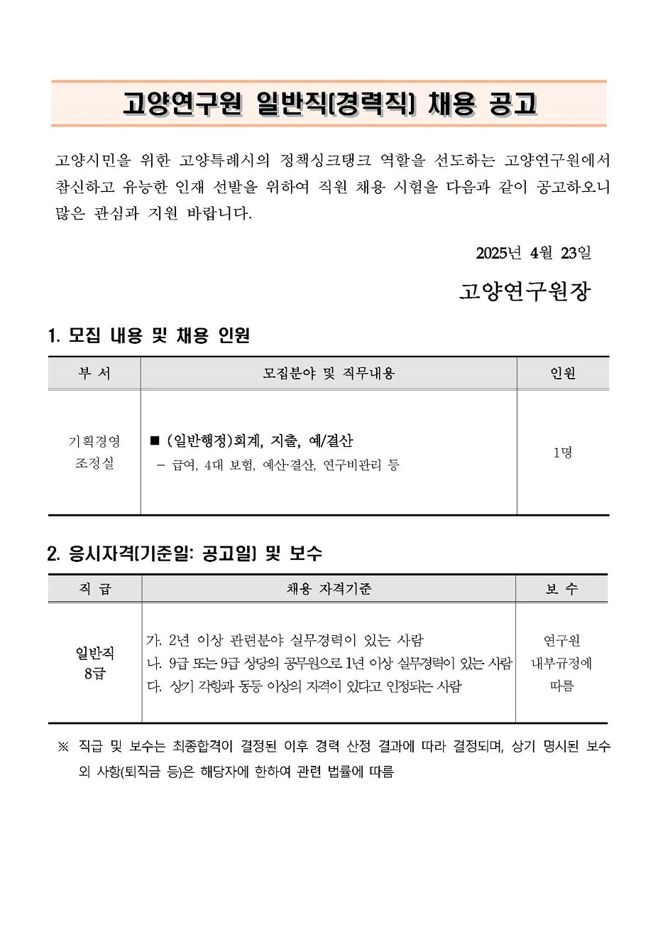 [제2025-5호] 고양연구원 일반직(경력직) 직원 채용 공고