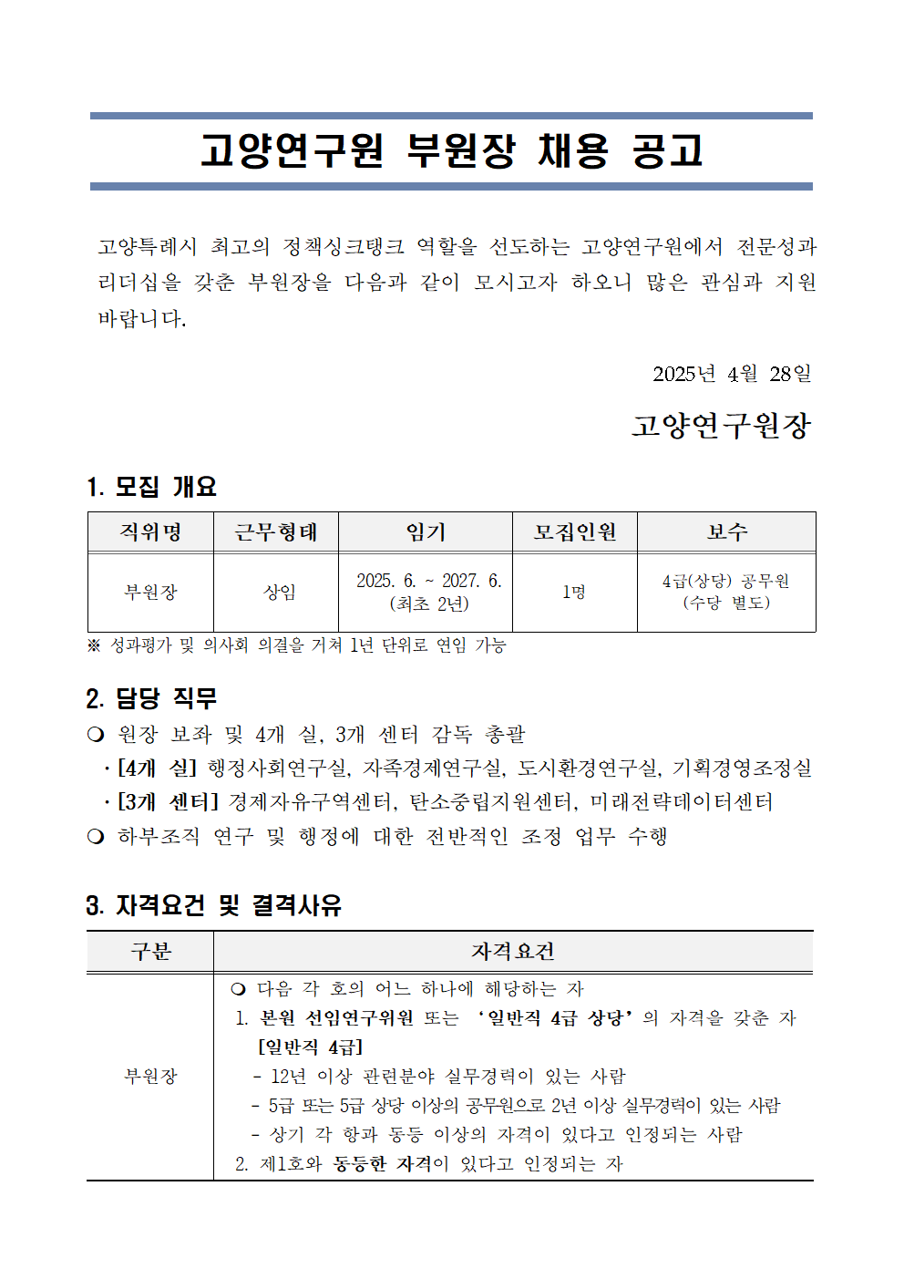 [제2025-6호] 고양연구원 부원장 채용 공고