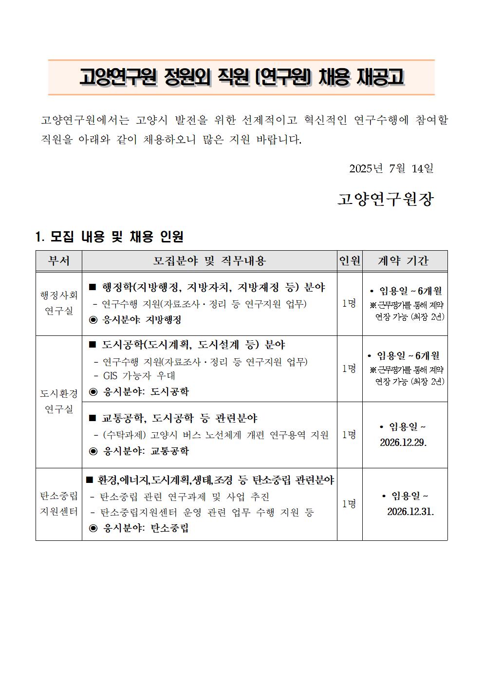 [제2025-07호] 고양연구원 정원외 직원(연구원) 채용 재공고