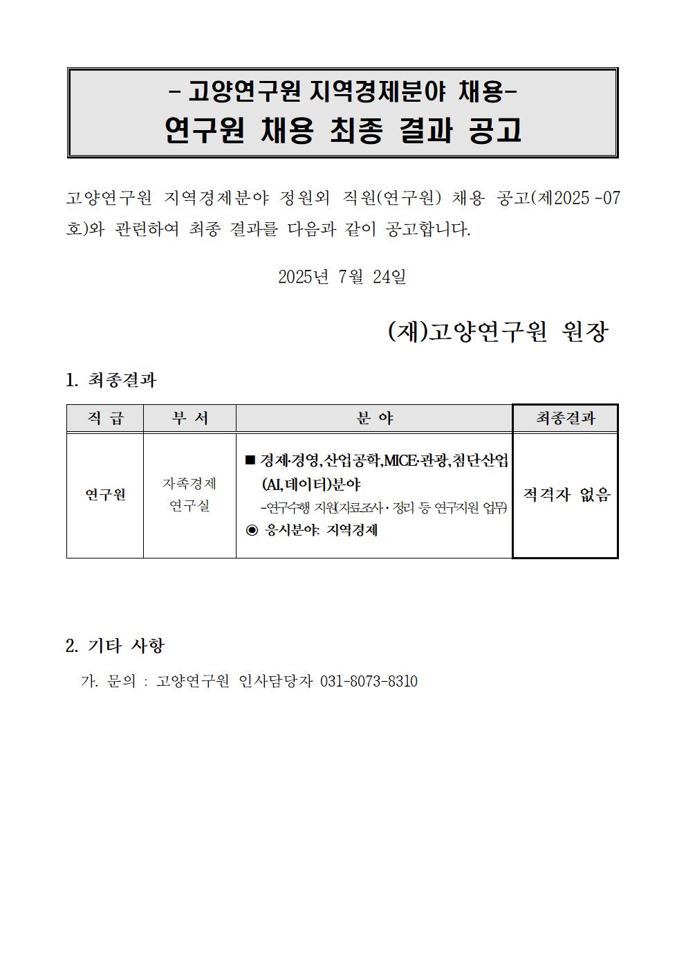 [제2025-07호] 고양연구원 지역경제분야 정원외 직원(연구원) 채용 최종 결과 공고