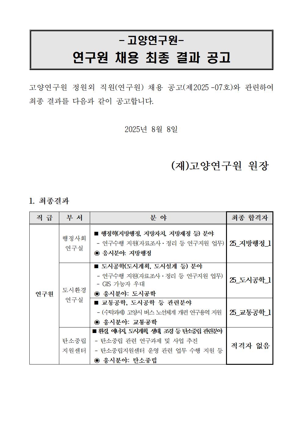 [제2025-07호] 고양연구원 정원외 직원(연구원) 채용 최종 결과 공고