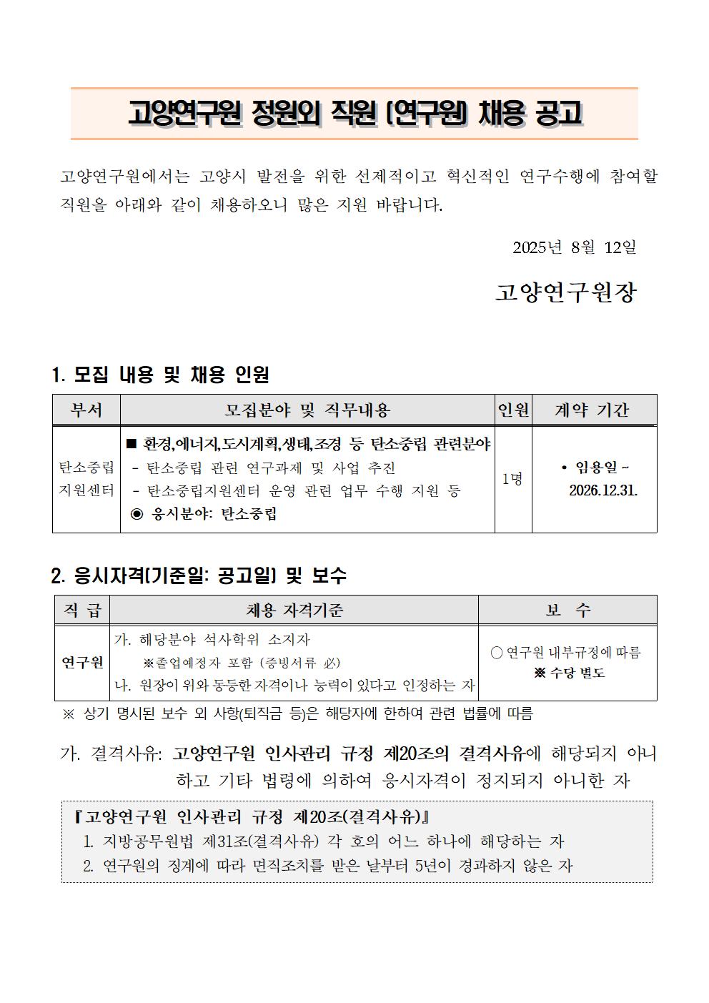 [제2025-07호] 고양연구원 탄소중립분야 정원외 직원(연구원) 채용 재공고