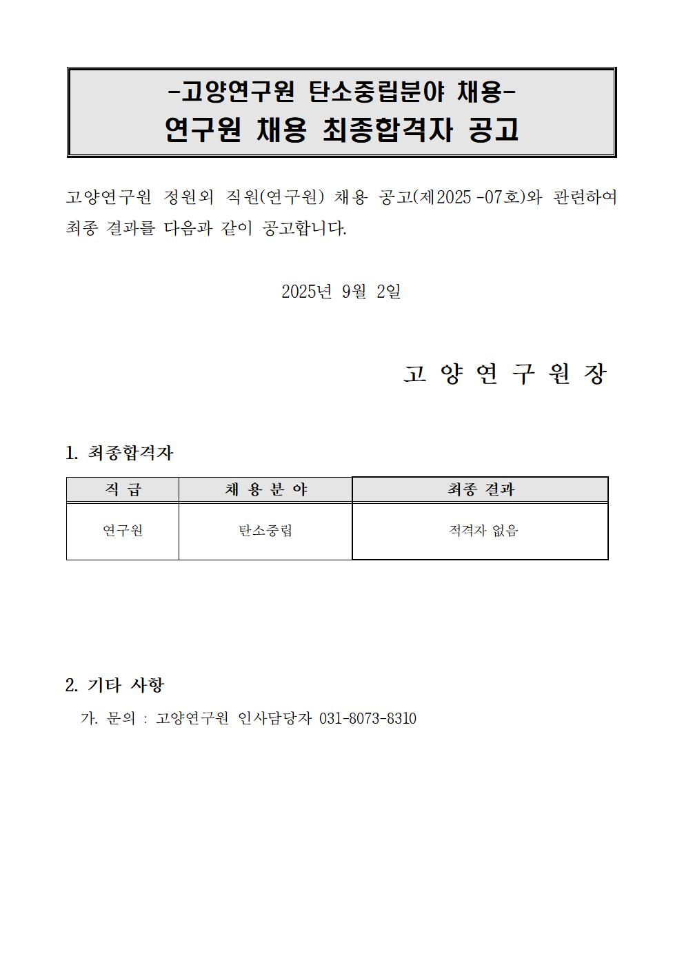 [제2025-07호] 고양연구원 탄소중립분야 정원외 직원(연구원) 채용 최종 결과 공고