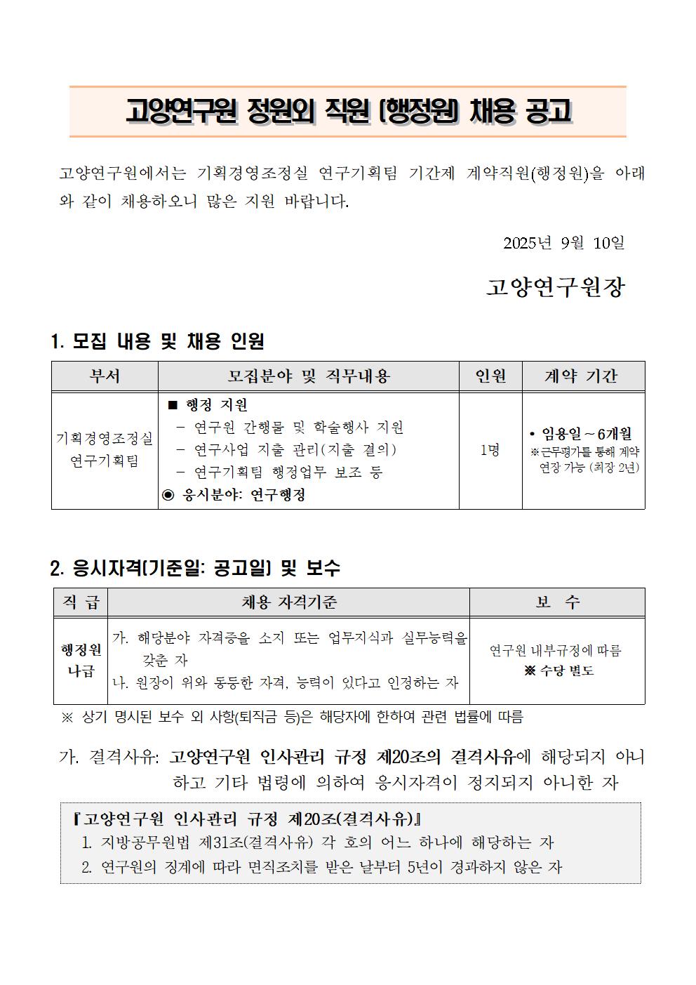 [제2025-08호] 고양연구원 정원외 직원(행정원) 채용 공고