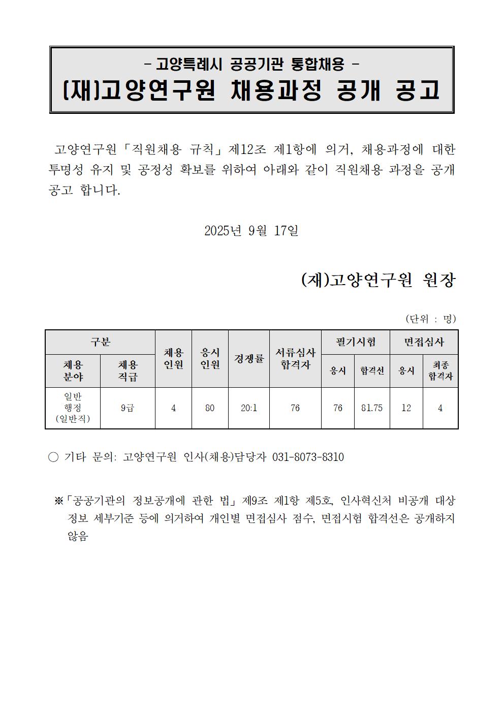[제2025-09호] 2025년 고양시 공공기관 직원 통합채용(일반직) 채용과정 공개 공고