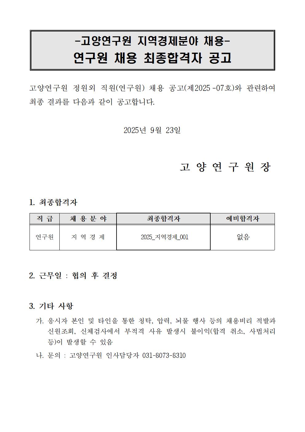 [제2025-07호] 고양연구원 지역경제분야 정원외 직원(연구원) 채용 최종 결과 공고