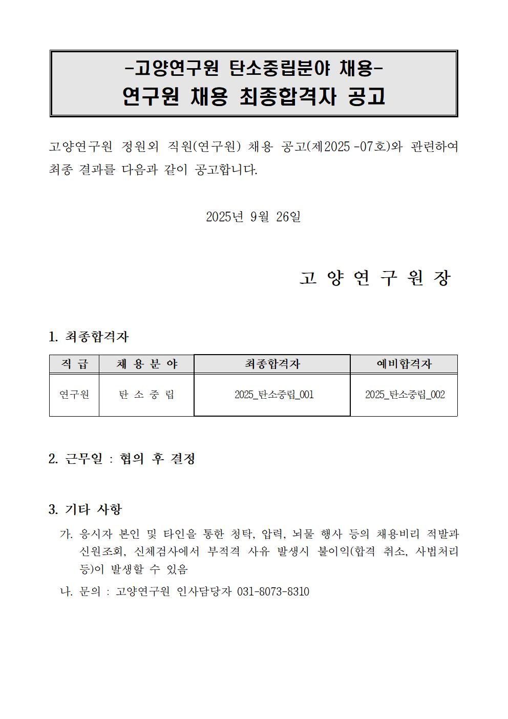 [제2025-07호] 고양연구원 탄소중립분야 정원외 직원(연구원) 채용 최종 결과 공고