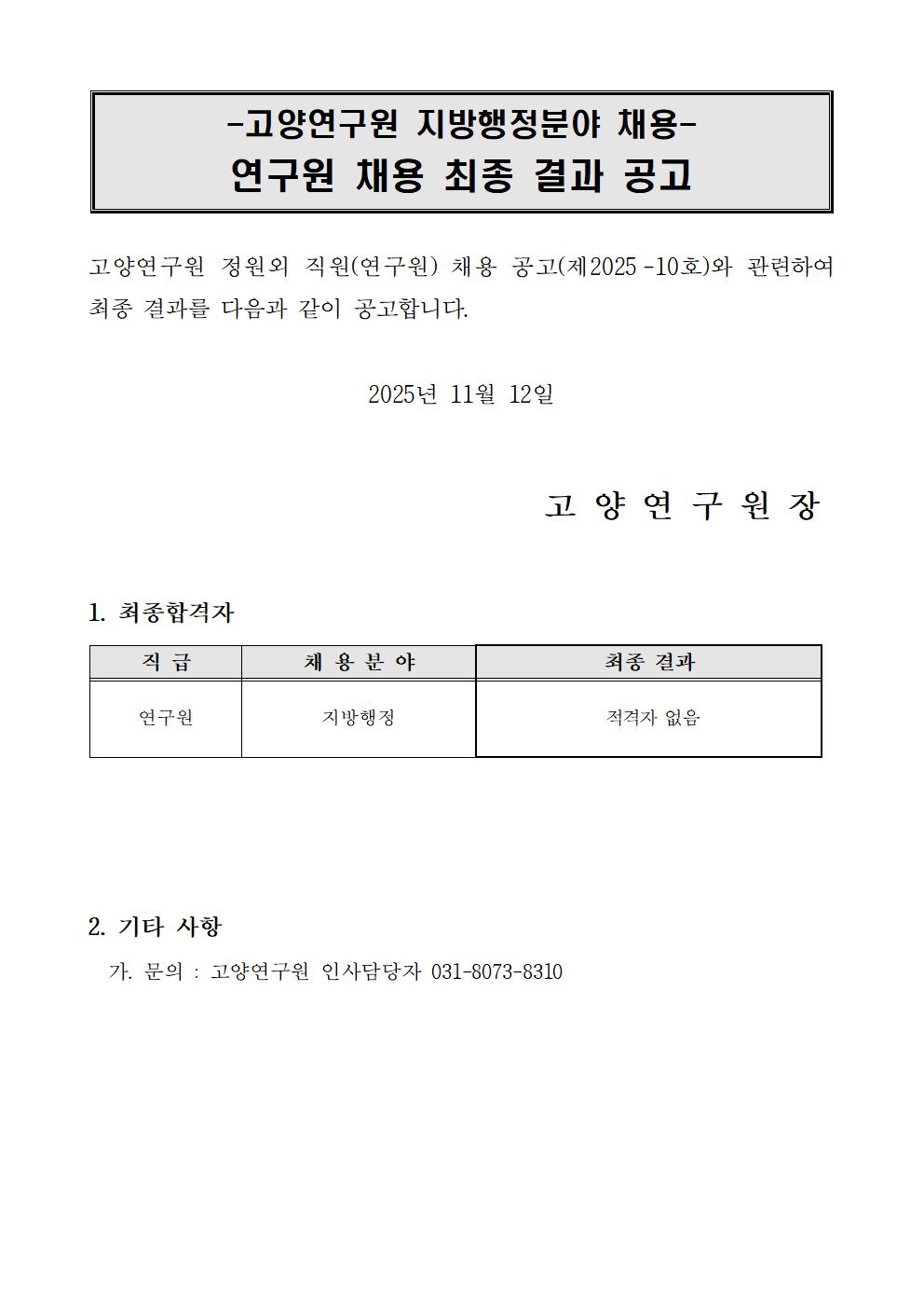 [제2025-10호] 고양연구원 지방행정분야 정원외 직원(연구원) 채용 최종 결과 공고
