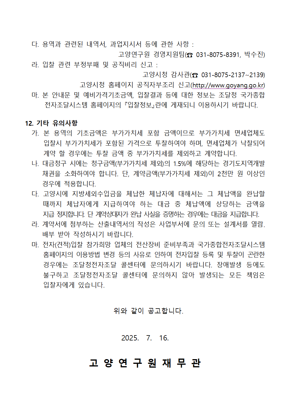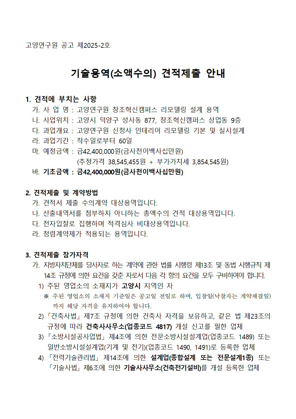 [제2025-2호] 고양연구원 창조혁신캠퍼스 리모델링 설계 용역 입찰공고(소액수의견적)