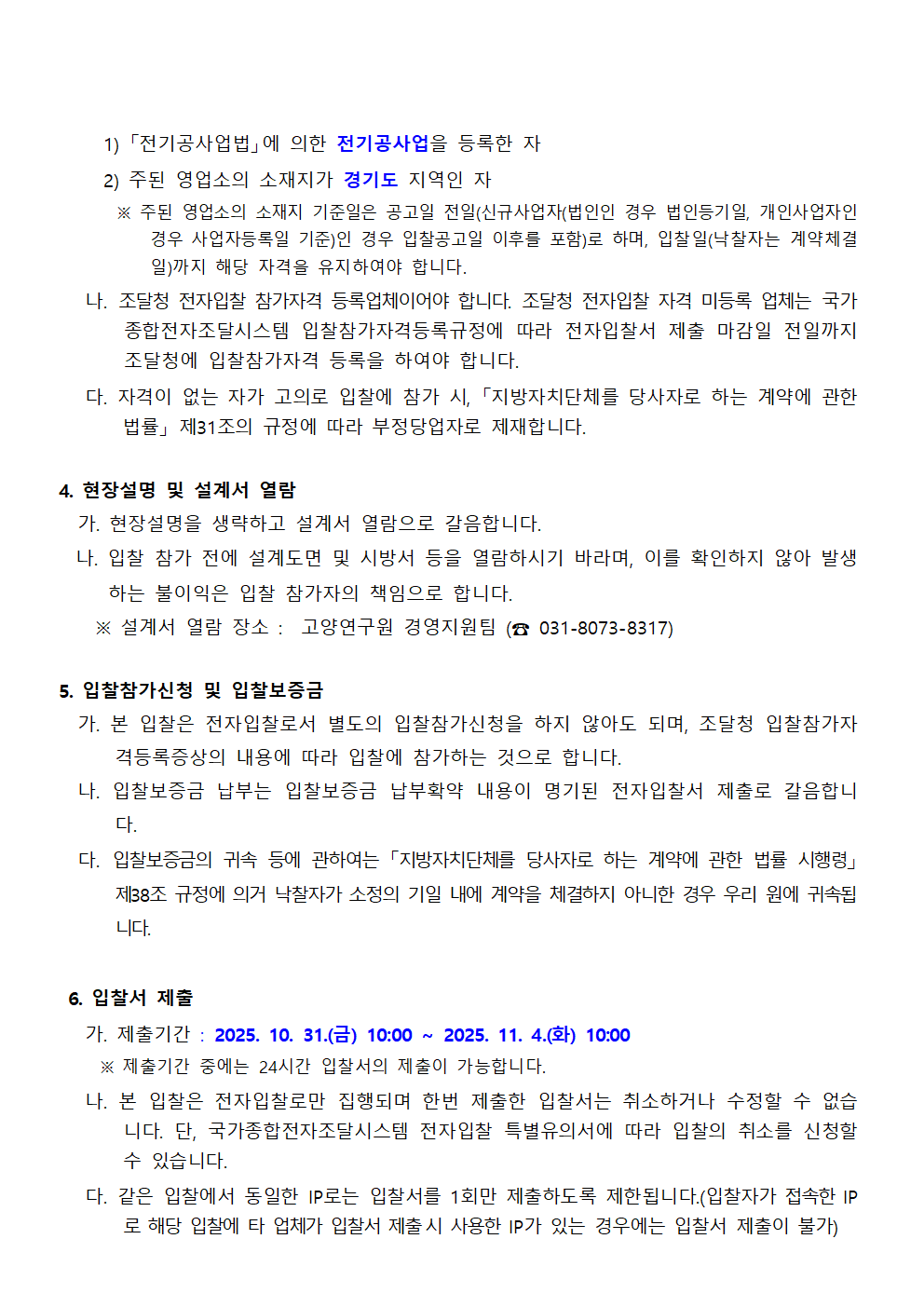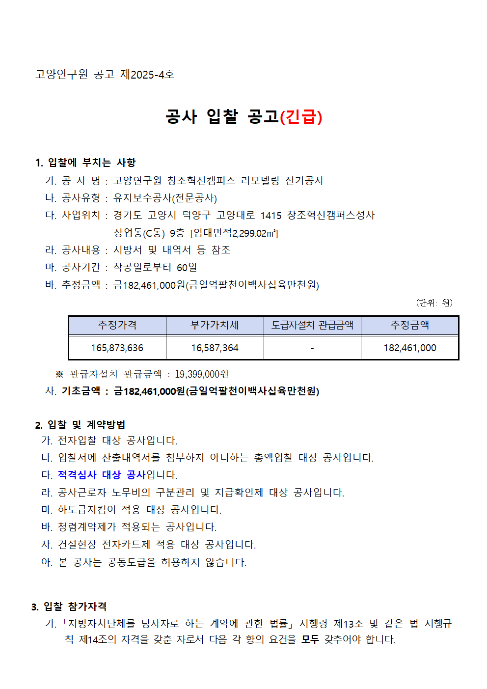 [제2025-4호] 고양연구원 창조혁신캠퍼스 리모델링 전기공사 입찰공고(긴급)